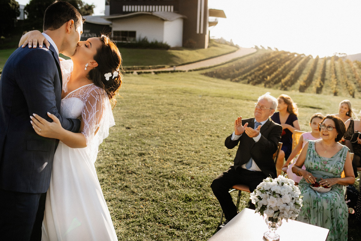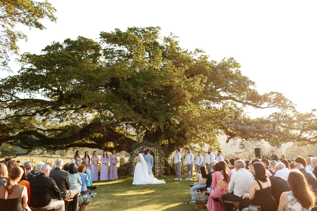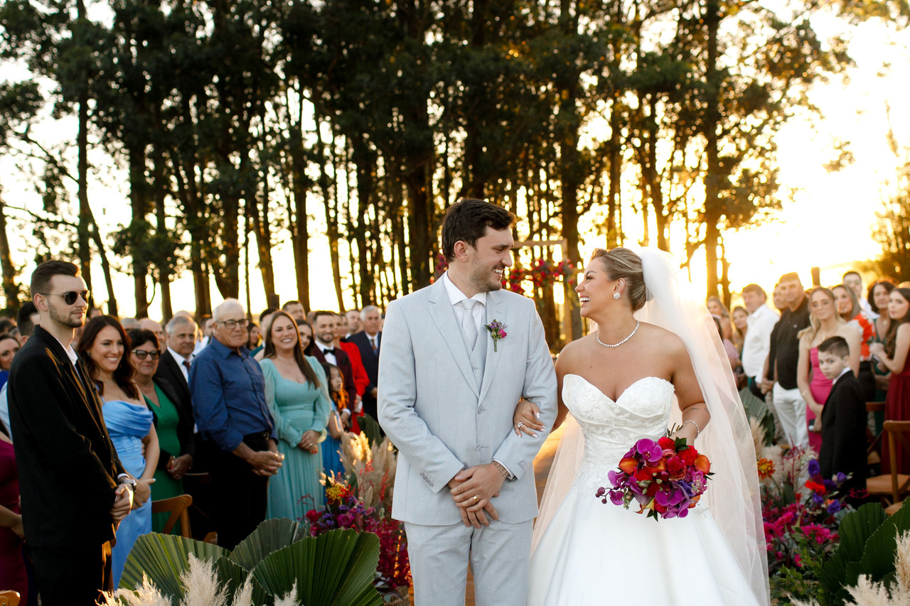 Para aproveitar o melhor da luz do dia, programe o início da cerimônia para 1h30 antes do pôr do sol e indique no convite que começa 2h antes do pôr do sol. Isso garante que os convidados cheguem pontualmente e permite tempo hábil para as fotos exclusivas após o casamento.